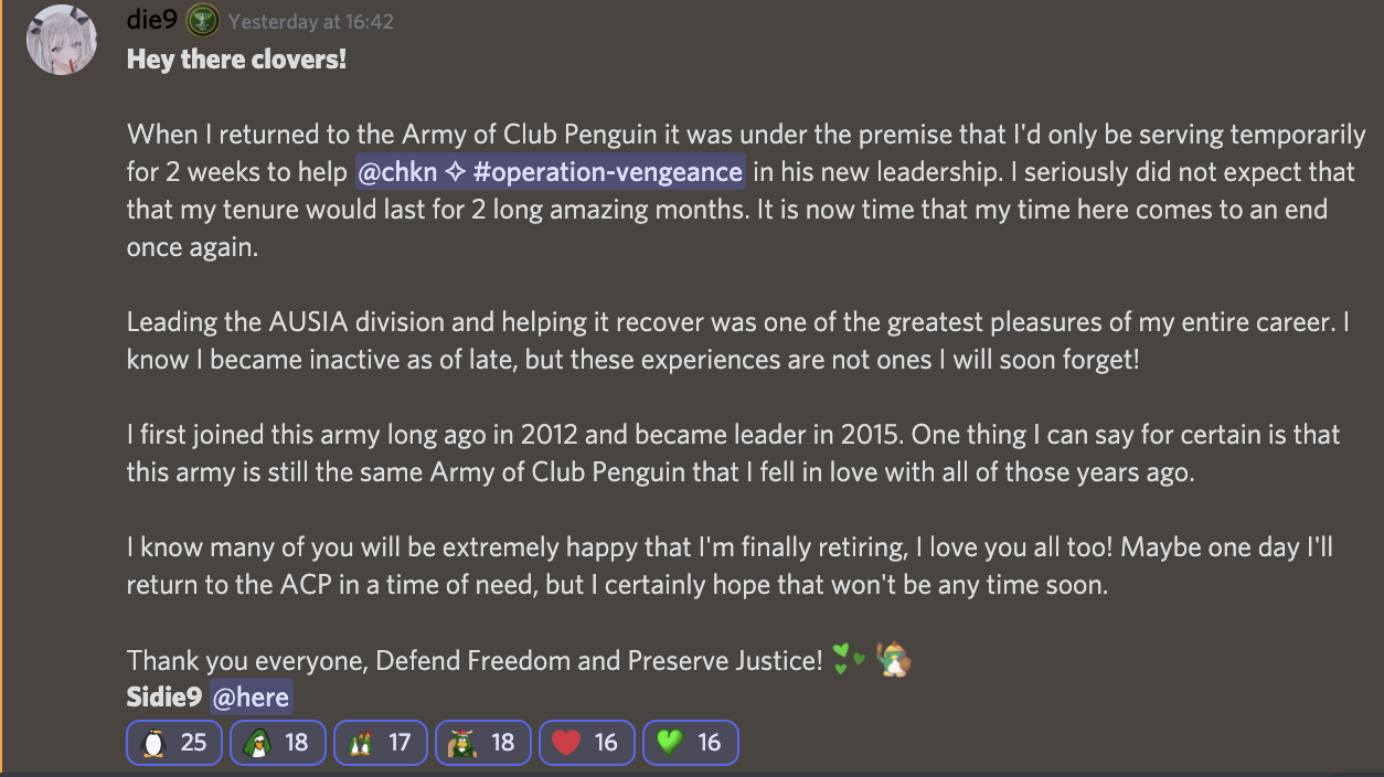 The Army of Club Penguin is currently in the midst of a brutal alliance war, and together with their allies in the Vengeance Alliance have been in heated battles against the Western Bloc. But as the war continues to rage on, former ACP leader and legend Sidie9 has stepped down from her position of General within the ACP Higher Command.