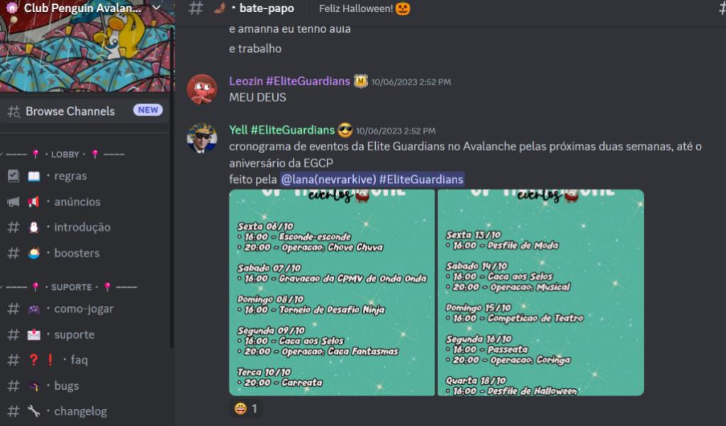 The current chronology of our issues according to our investigation stems back to October 6. EGCP leader Fitsuki was seen freely advertising the Elite Guardians’ upcoming events in the main discussion channel of Club Penguin Avalanche’s discord server— talking about the army’s upcoming events and going as far as requesting members of the Club Penguin Avalanche discord to attend their event.