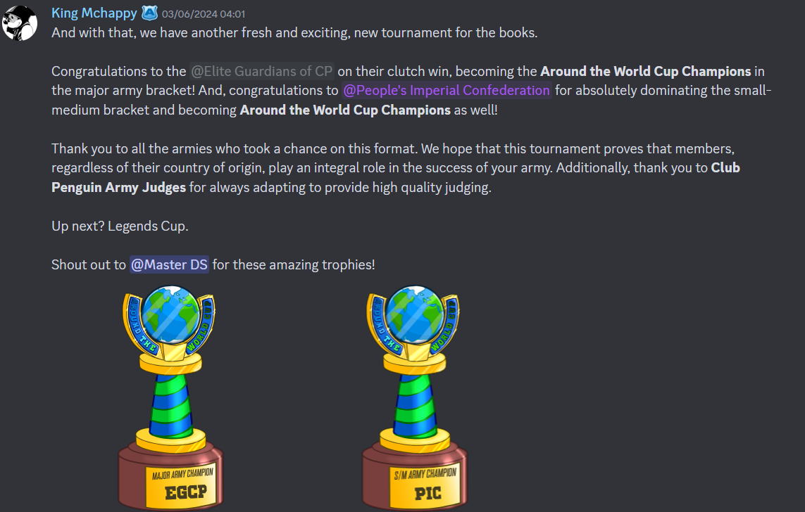 The Around The World Cup was officially revealed on May 12th, seeing a new tournament being etched into Club Penguin Armies’ history with a creative format. The format saw armies compete in a round-robin tournament, aiming to top their group to progress to the finals. Several battles took place during different time zones, showcasing the strengths and weaknesses of each army. Out of the two brackets, only four out of eight armies made it to the finals. These finalists consisted of one major and one small/medium army from each bracket.