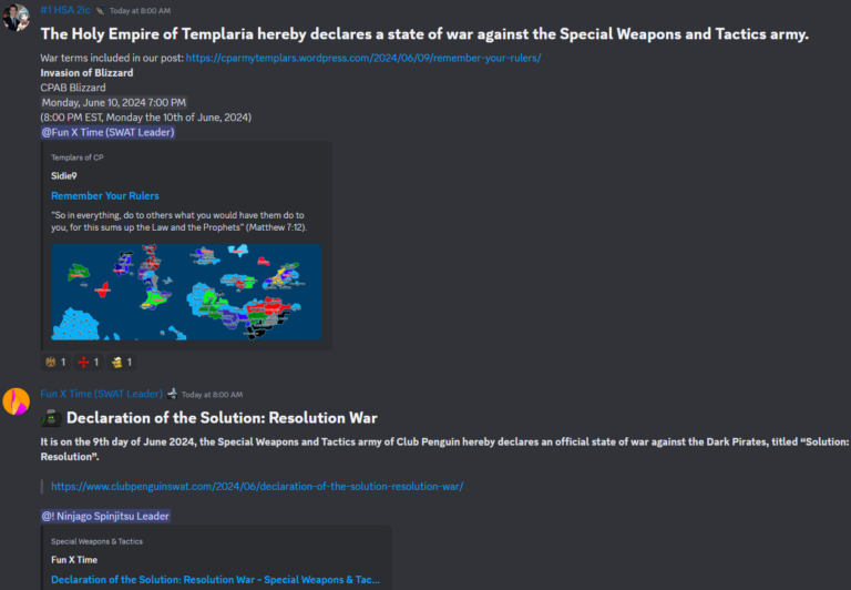 The community already had a slight taste of what the map could mean for armies, wars and more. However, predictions were soon made about what would occur on June 9th, also dubbed as Doomsday. Upon the map being unfrozen, armies flocked to schedule invasions and declare war. However, this led to many armies declaring war, leading to some declarations being invalidated. Both Special Weapons And Tactics and Templars declared war, TCP on SWAT and SWAT on Dark Pirates. This was also followed up by the Elite Guardians declaring on Templars. However, only the Templars’ declaration was deemed valid due to them being the first to declare.