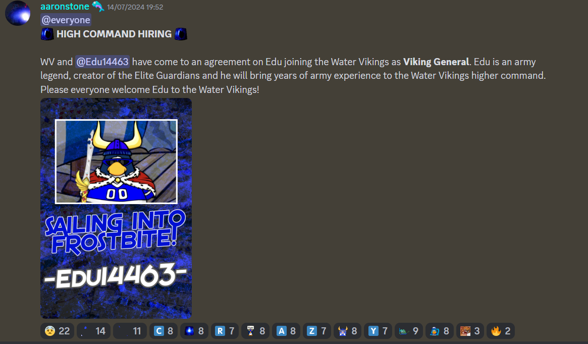 Following a successful run in the Elite Guardians as both an advisor and Leader, Edu resigned from his leadership position and opted for a new journey outside of the army. On July 14, the Water Vikings announced that Edu would officially become a Second In Command within the army. The move took many people by surprise because Edu spent many years building his army (EGCP) to become a major player within the community.