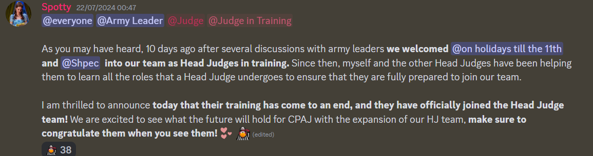 On July 22, Club Penguin Army Judges announced a major change within its ranks. After approximately 10 days in training, the duo of Shpec and Jojo Teri were promoted to Head Judge. Jojo and Shpec originally joined CPAJ in 2022. Since joining, Shpec has judged over 70 battles and has been a key figure within the organisation. Jojo has judged over 40 and, like Shpec, has been an active figure within CPAJ.
