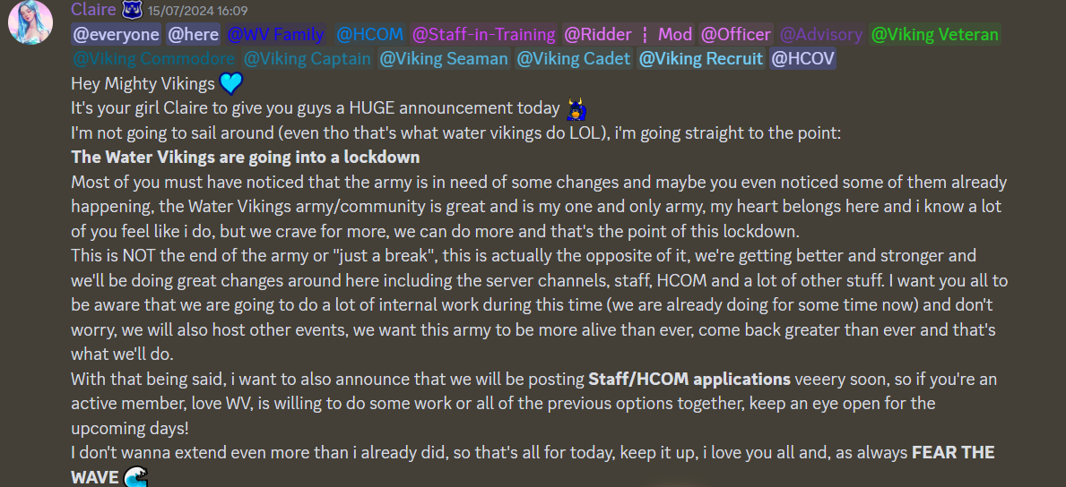 On July 15, 2024, Water Vikings leader Claire announced that the army would be going on lockdown. The lockdown was put in place to allow its leaders to make some changes within the army to enable growth and sustainability. These were not the only reasons for the lockdown. However, they were arguably the most important.
