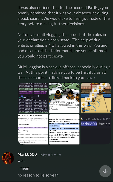 The war declaration states “The help of dual enlists or allies is NOT allowed in this war.” Mark06 understood he would not be able to attend and has discussed with an Admin prior regarding this and how he will not be able to attend these battles. Additionally, it was found that Faith’s account was a way to deceive the administration and any individuals watching the conflict take place.