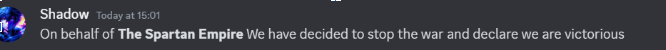 Additionally, after this, we created a group chat with the Leaders of Brownies and Spartans and allowed the Spartans to decide what happens next, much like Secret Service vs Winged Hussars. Ultimately, they decided to end the war due to Brownies multilogging, using duel-enlists and breaking the war terms. Therefore, they have been declared as the victors of the war. Furthermore, the two armies have decided to create a peace treaty, ceasing all hostilities.