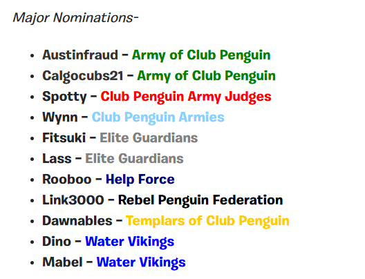 Dino is also known for his contributions to army leagues and the overall army community. He is most famous for his administration of the Club Penguin Army Wiki, as its Bureaucrat. Dino has also served as the Vice President of Club Penguin Army Media, as well as various positions in other media organisations. Additionally, Dino has served as Club Penguin Armies’ Head of Branding and Community Committee Head. Furthermore, he has been a designer for Club Penguin Army Battleground.