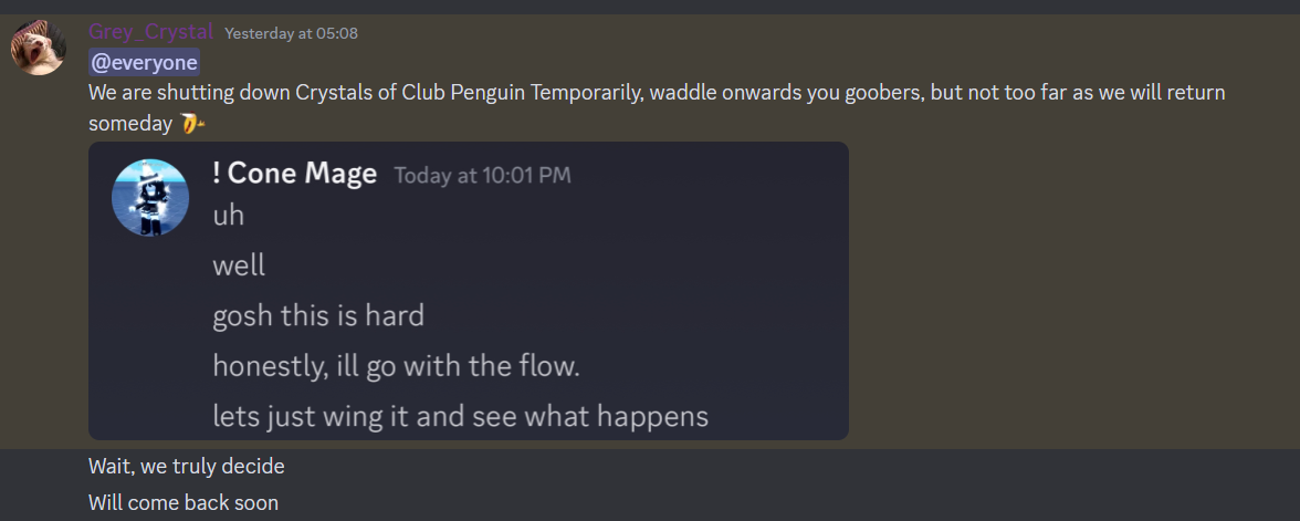 Crystals is relying on allies for size, A TCP hcom asked to close it to rebuild TCP, I accepted and asked the other Crystal Leaders, Elsa said Yes, Valkyrie was hesitant but said yes. Crystals also is taking away unintentionally from TCP. We wont be shut down forever, we’ll return if TCP successfully rebuilds or fails too.