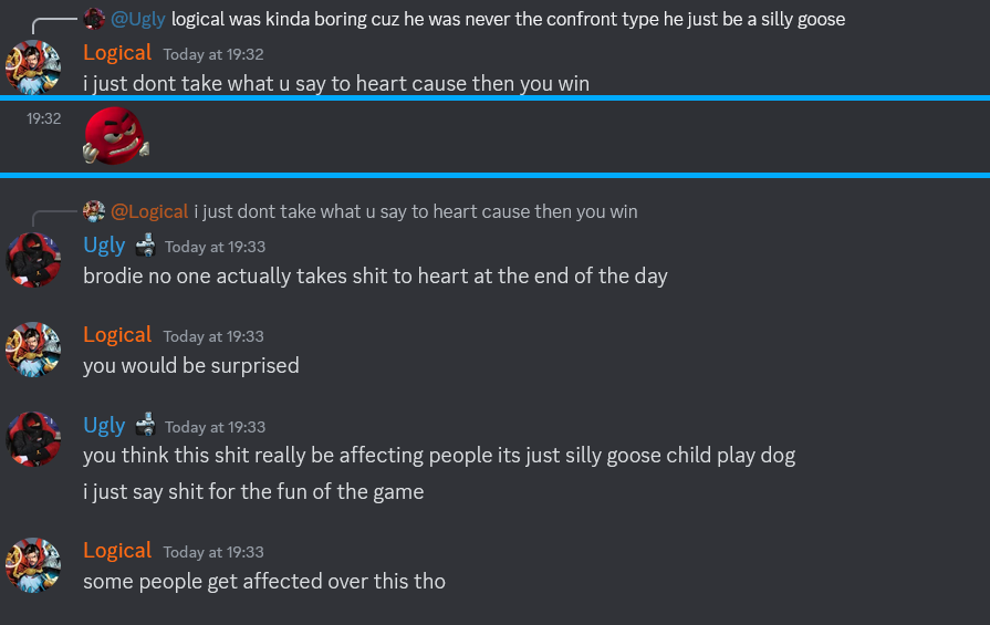 Quite unlike CPA, a meaningful conversation which started out somewhat fuel-filled took place within the community chat. During Ugly and Logical‘s banter, a comment was made about Logical. It was from here that a conversation was started regarding people taking armies seriously. Ugly believes that no-one takes anything that happens in armies to heart but I, much like Logical, beg to disagree. Throughout CPA history, there have been times where heated instances have become personal. Even outside doxxing and such, things that happen within armies can be extremely agitating and even hurtful. This has led to many people being hurt.