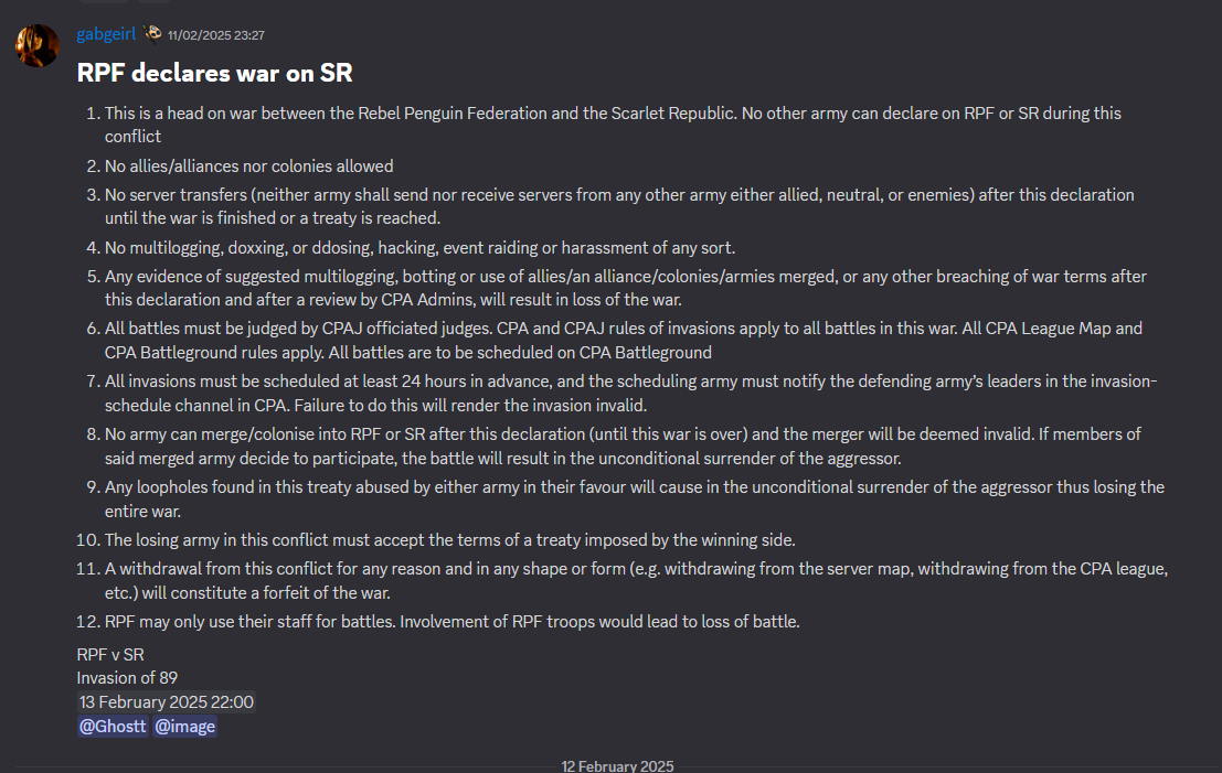 On February 11, just before SR’s one-month anniversary, the Rebel Penguin Federation declared war on them. This would go down as the first war that the Republicans would ever engage in, and RPF’s first war of 2025. Strangely, one of the Rebel’s war terms limited them to only allowing Staff to participate in battles. This would effectively cap RPF to a max of 41 – the number of staff troops they have.