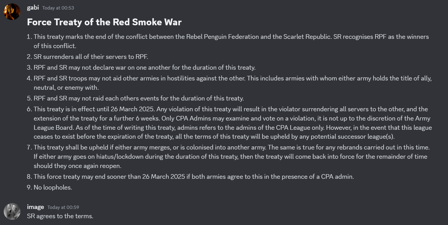 Very little is known about the war and subsequent treaty. To better understand the situation Club Penguin Armies reached out to Gabi, RPF leader, alongside Scarlet Republic leaders Imvge and Ghostt, however, all declined the opportunity.