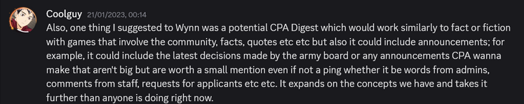 Whilst CPA has had its setbacks, I am proud of what we have been able to produce. A tough question to answer is what my favourite thing of this Administrative run has been. Honestly, it is hard to think about, but I enjoy the intricacies of war and the ruling of everything. That kinda stuff I really love to work with because I know CPA like the back of my hand and it’s intriguing to see all of these different situations pop up and, as a former leader, I can relate to many situations while also disagreeing with their views completely LOL. But being a former leader definitely adds some perspective to it. It allows you to see things differently, and one thing I would always do is sit back and look at both sides. It is only then that you can see the full picture.