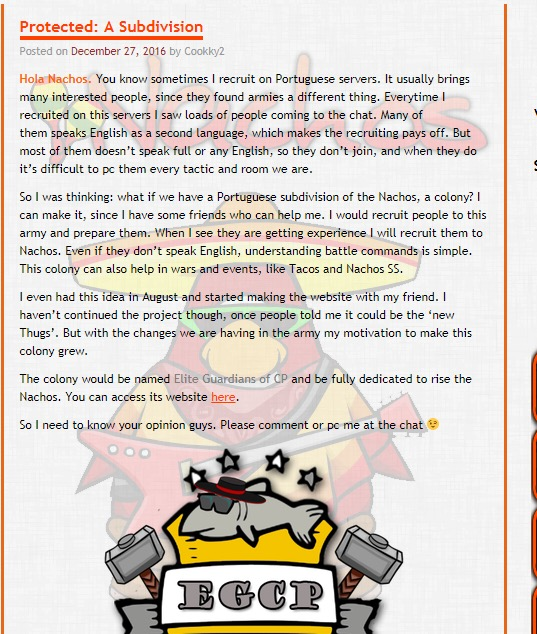 During the shifts of leadership, Cookky had once again presented this idea to the new leadership. The idea was to bring cultural diversity into the army and no army had ever done that before. The new leaders had appreciated his idea and he made an announcement to the public questioning the presence of a foreign division being under the jurisdiction of the Nachos, making them even more powerful. By the end of January 2017, Cookky was appointed as the Nachos leader. Henceforth, with his new powers, he had instated the Elite Guardians into the Nachos as a colony.