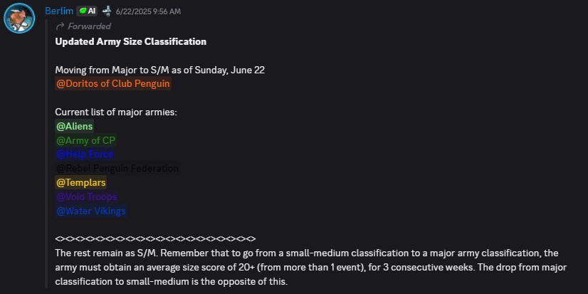 Amidst internal controversy and leadership disputes, several members opted for retirement, precipitating a period of instability for the Doritos. This tumultuous phase saw a marked decline in their event participation. Resultingly, they recently fell to the Small/Medium army status following an extended era of diminished activity.
