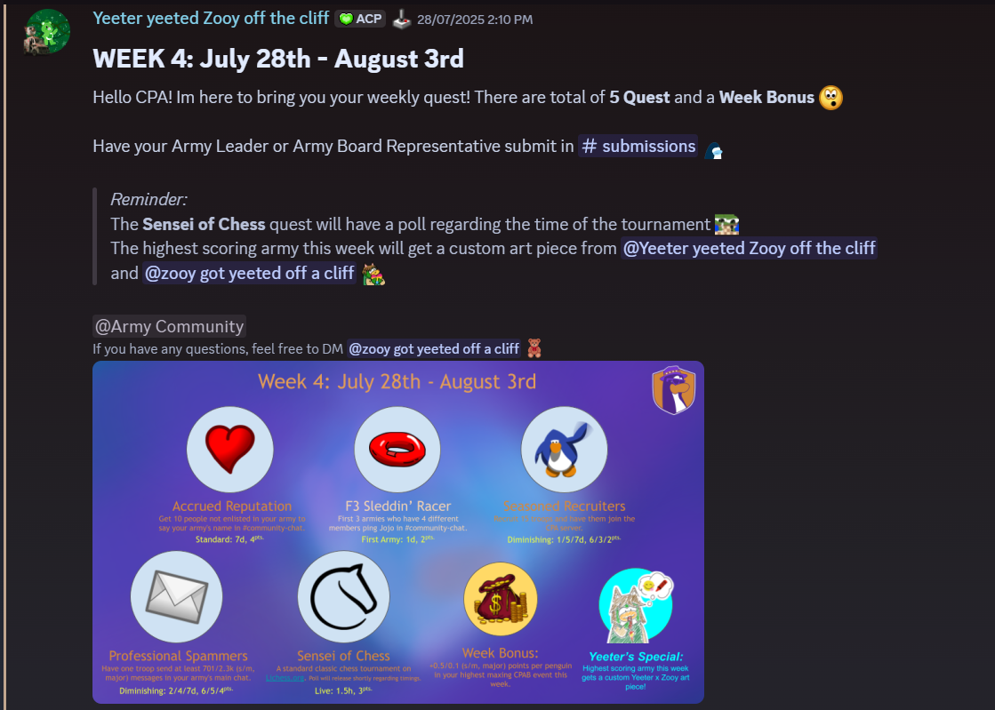 Frickle & Zooy, Community Committee Heads: TheYeeter101 has been a great team member in CC, he’s been amazing, going above and beyond, contributing to parts of CC events. He may not be the most active on the day-to-day schedule, but he gives it his all when he does participate. He really is someone who focuses on quality over quantity. Although it may not seem like that right now, Yeeter has been helping with 2 exciting events that aren’t posted to the public yet! His idea and execution of the Yeeter bonus in the Olympics was really good, but I am biased because I also had a lot of fun making it with him. Really excited to see what he’ll contribute next, and hope all of YOU are as pumped as you should be for the CC works coming out in the future!