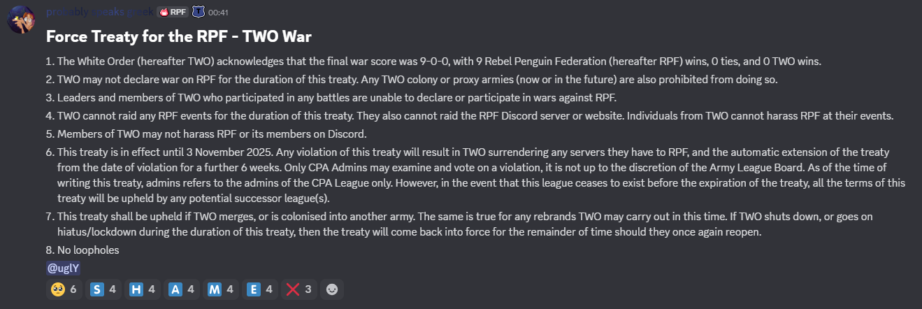 5:40 PM EST – RPF successfully invades Crystal, continuing their win streak. TWO didn’t show up in the battle. The final war score ended up being 9-0 in favor of RPF. As soon as the battle ended, the Rebels posted the force treaty against TWO which can be seen below.