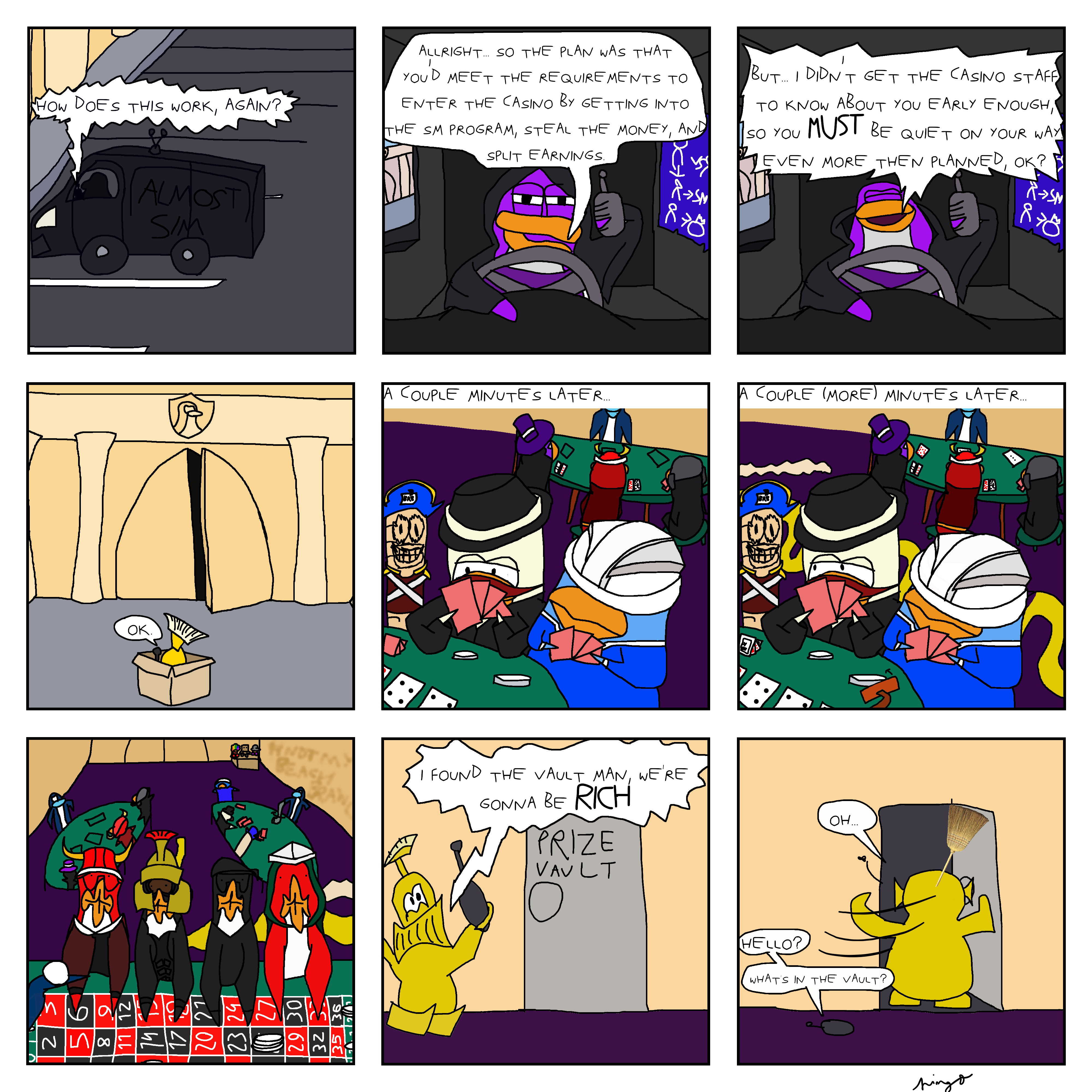 The Summer Blitz had just arrived in town as a brand new Casino for the community! Giving the same Lucky Fever that we saw in Legends Cup XV, but only for the Small/Medium community. In this comic, both Void Troops and Templars scheme a plan to sneak into the Club Penguin Armies Casino with the goal of taking whatever valuables they could find… Hijinks ensue as we now watch how the inside of the casino looks, only to find out that the grand prize was… Nothing.