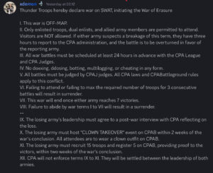 Since their revival, the Thunder Troops have taken no time in engaging in both diplomatic and military operations. And so, on October 9, the Troops initiated the War of Erasure against SWAT. This is yet another display of the increase in wars we are seeing, especially in recent weeks.