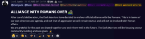 Internally, we do not believe this will hurt the Dark Warriors. Instead, it has reaffirmed our unity. We made a decision to unally with the Romans in order to preserve the integrity of our army and make our members realize that we do not tolerate disrespect or lies especially when they are from so called allies. By upholding our leadership and being resolute regarding our values, we’ve only solidified the loyalty and trust in DW. Our troops know that leadership has their back, and that is what makes us strong.