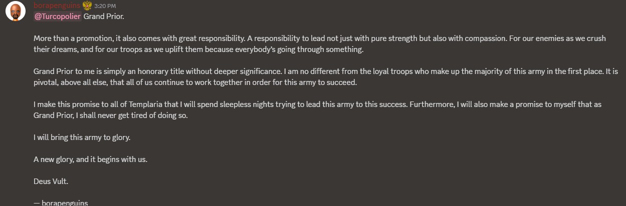 On October 11, we witnessed two long-time TCP members being promoted to their leadership roles. Borapenguins and Zez have both been active and integral members of the Templars in recent months, and as a result, they were promoted to the rank of Grand Prior, TCP’s leadership rank.
