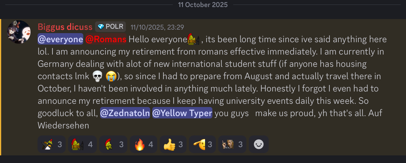 Toxic’s departure does not come as a surprise to those aware of the Romans’ current state. After being relatively inactive for the past few weeks, it is evident that a change was required, which Toxic reflects in his resignation letter.