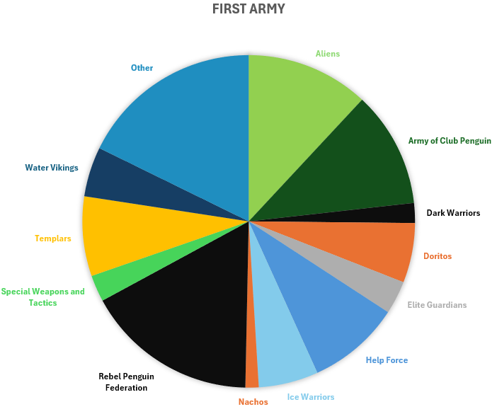 From this chart, we can see that the most popular option was the “Other” option, which gathered 17.7%. Apart from it, most people’s first army was the Rebel Penguin Federation with 16.8%. It was followed by the Aliens with 11.9% and the Army of Club Penguin with 11.3%.