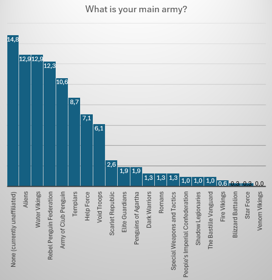 The Aliens and the Water Vikings came second this time, with the same number of people choosing them. In 2023, the Water Vikings were third, while Aliens weren’t even a choice. Behind those two, it was RPF and ACP, while they were fourth and second in 2023, and fifth and first in 2014. Notably, the Elite Guardians of Club Penguin, who were tied in the fourth place with RPF in 2023 are now the tenth most popular army. At the same time, the recently revived Dark Warriors were twelfth in this census and fifth in the 2014 one. The Venom Vikings was the only army that wasn’t chosen by any responder.