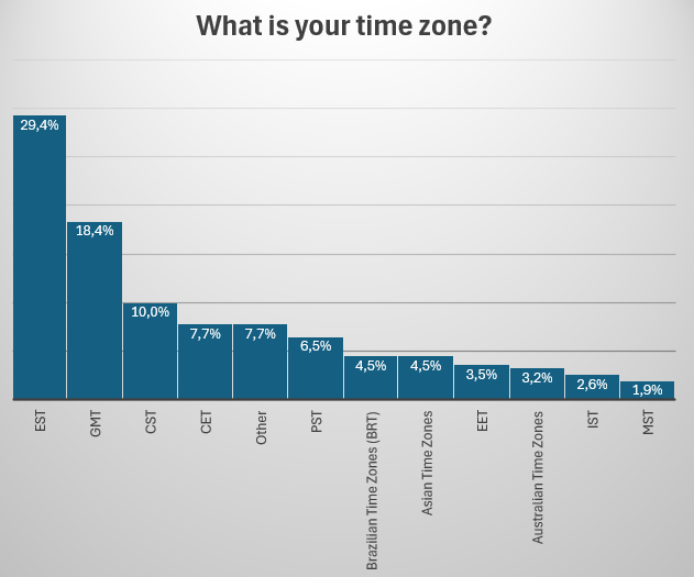 The second most popular timezone is GMT, getting 18.4%. In 2023, it received 20.4%, in 2014, 16%, while in 2011 it came third with 16%. It was followed by CST with 10%. CST had 7.7% in 2023, 7.7% was CST, in 2014 14% and in 2011 it was second with 21%.