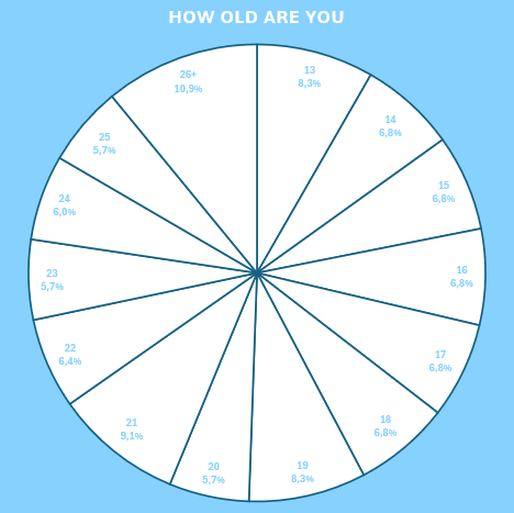 Interestingly, all choices got a similar percentage, which shows an even age distribution within the community. Aside the 26+ group, 21 was the 2nd most popular followed by 13 and 19. All age groups, aside from 26+ and 21, received around 6-8%. This can be better visualised through chart 11, which shows how many people chose each option.