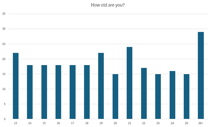 The results of this question were the most surprising ones. Even after extending the single-year options up to 25, 26+ was the most popular one. In 2023, the most popular age category was 21+, with 28.6% of the responders being in it. This time, if there was a 21+ category, 43.8% would be in it.