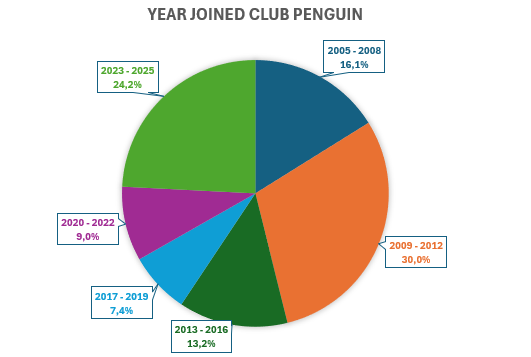 In total, 51.2% of the people joined the community in the past 3 years. 24.8% joined during or shortly after the COVID era, 2020-2022, which was the second most popular choice. 13.5% joined right after the Club Penguin shutdown.