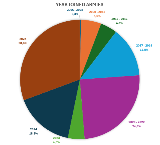 From the chart we can take out much information. The most popular category is 2025, with a large percentage of people also joining in 2024, showing again the armies’ recruiting efforts. 30,6% of the people who completed the census joined this year and 16.1% the previous one.