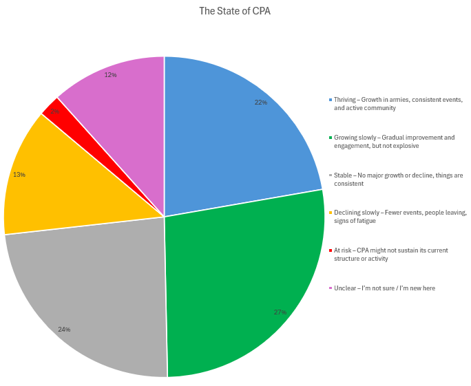 This year, in August, the second CPA census took place. The results were expected to be released much earlier, but recent events and the need to address them pushed it back. It contained a single form with the same mandatory main questions as 2023, with the addition of the question regarding the state of CPA as a whole. It also had an optional part with the same question, with the addition of the religion question. This allows us to compare most of the answers with the previous census results. Also, notice that all censuses apart from the 2020 one happened during the summer.
