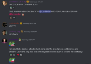Throughout the summer, the army engaged in several wars, including battles against the Help Force. However, one of the most taxing moments of Echo’s leadership came during the War of Vengeance against the Secret Service, a conflict that resulted in an 11-0 loss for the Templars. The defeat marked a difficult period for the army, as many leaders and high-command members departed in its aftermath, leaving the Templars to rebuild from within. Toward the end of 2024, the army focused on rebuilding, briefly regaining Major status and even participating in the Christmas Chaos XIV tournament.