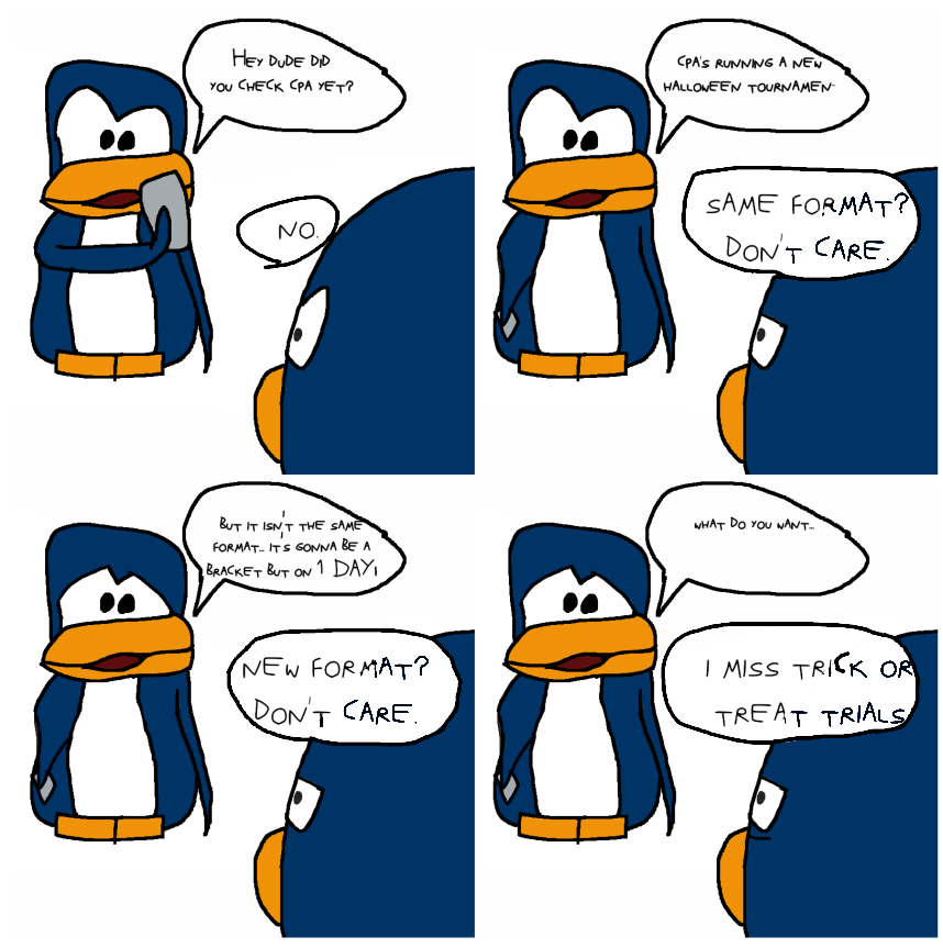 In the comic, we see two penguins talking with each other. The first one reads the October Horrors tournament announcement. Then it informs the other penguin about what it just read. The second penguin portrays the stubborn members of the community. It doesn’t care whether the tournament keeps the usual format or a unique format like OH. It wants the Trick or Treat Trials tournament to make a return and is reminiscing about the times when it took place.