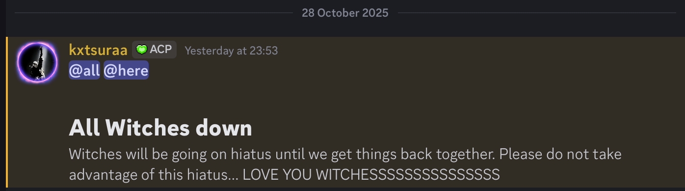 Following two and a half weeks of activity, the army has very abruptly closed their doors. On October 28, Witches leader Katsura announced that the army would be going on a hiatus until they had to time to restructure and improve internally.