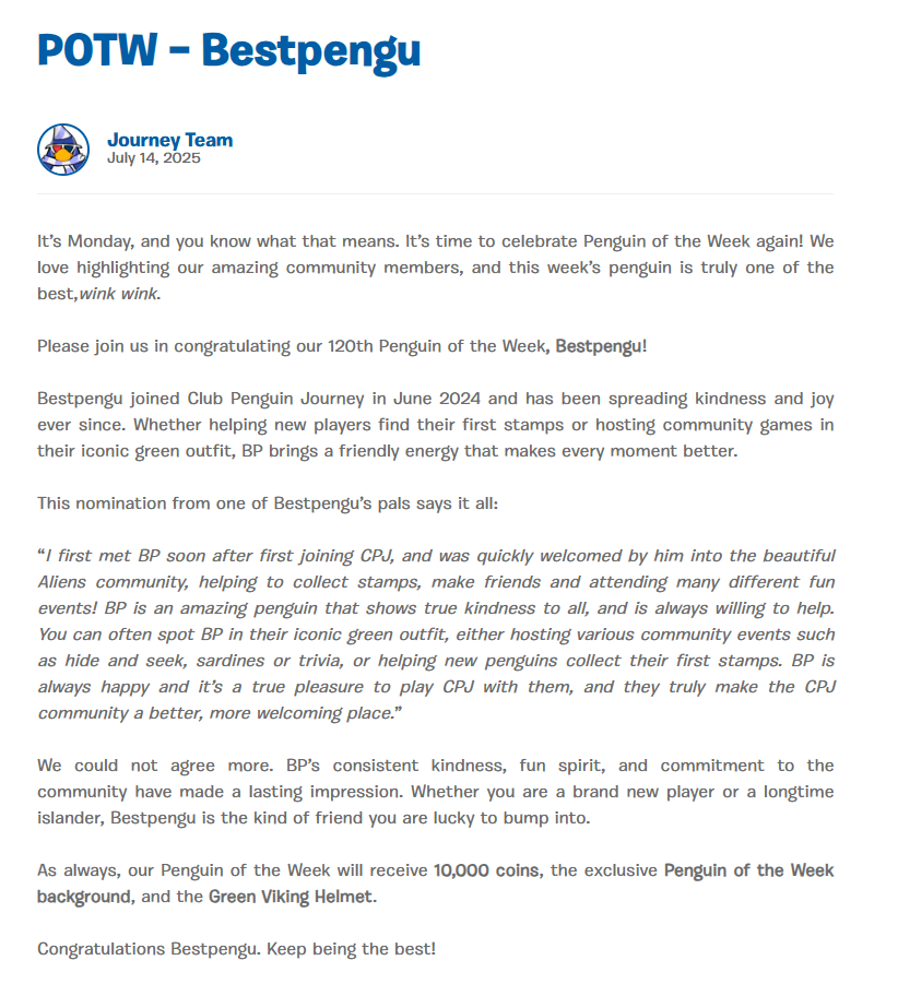 On July 14, there was a post released by the official CPJ team in their website regarding BP. In that post, they awarded BP with the title of “Penguin of the Week”. Thus, BP was the 120th POTW of Club Penguin Journey. The full post can be read below. The question that arises is how did BP manage to earn this rare honor of being the Penguin of the Week in CPJ? Only 137 people have accomplished this at the time that the post is written. Why else would an army leader, a kind hated by several CPJ members, receive this award, unless they actually are the CPPS owner?