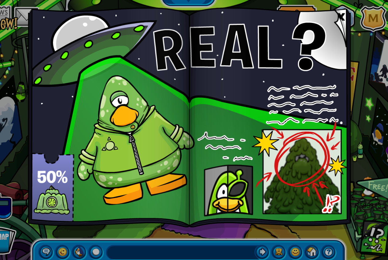 As you can see, on the bottom left, there is a catalog. Guess what you can find in it! Another alien uniform, in a different style now. This time, the item has a special animation as well. If you press D, an animation begins with an alien kidnapping your penguin. It is a reference to the Aliens and especially their leader, BP, being evil. There is also a party quest involving the item, with it needing 20 penguins to dance, in the Dance Club, while using the item, to complete it. This shows that the item was an important part of the party with most CPJ active players obtaining it.