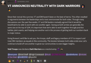 On November 8, two of the former leaders, Kira and Antman, stepped down from their roles. However, VT also made an announcement detailing the induction of two new leaders: Judy and Xdemon. Additionally, Chickans, Zekrome, and Baldo have been inducted into the VT Hall of Fame.