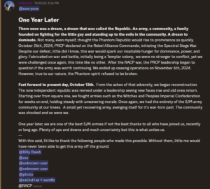 xDemon: Keeping it short, first joined Templars sometime February 2022 and stayed there as 3ic or 2ic until October 2024 when i first made PRCP. PRCP shut down late october, and I soon joined DCP in november eventually getting 3ic there before joining VT in may for LiT. I took a short break from armies through september and part of october, before coming back to revive PRCP for its second gen and then rejoining VT this time as leader