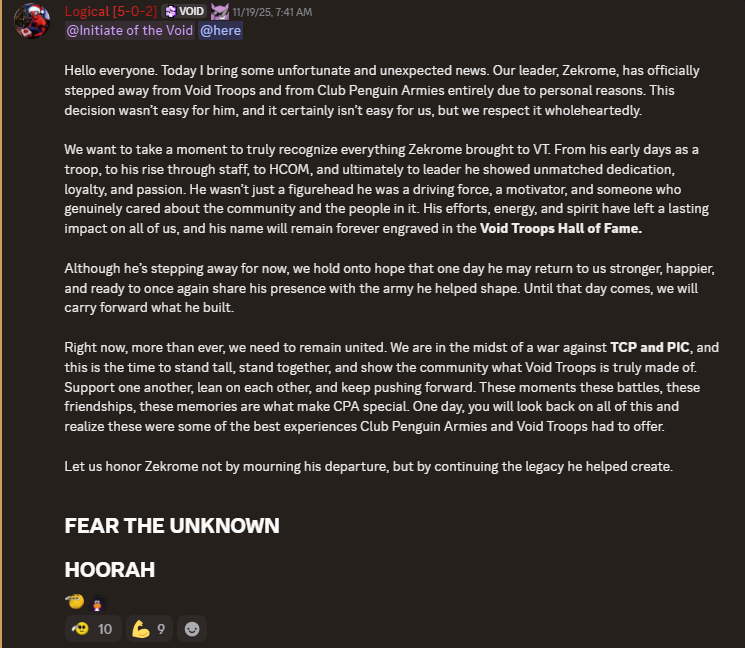 Zekrome is relatively newer to the army community compared to other present leaders, joining earlier this year. Notably, his first army had been the Doritos of Club Penguin, where he reached Fifth-in-Command before the army shut down. Soon, he resumed his army career in the Void Troops as a Staff-in-Training. Finally, he climbed his way up quickly, acquiring VT’s apex position in October 2025.