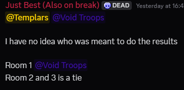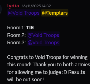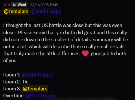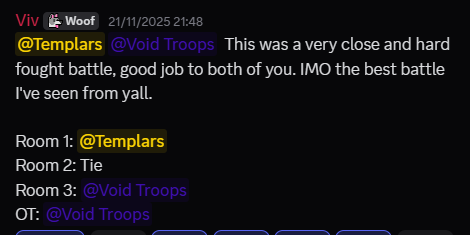 Yet another battle that would go to overtime, this began with the Void Troops taking an early lead. The first Room was decided by small details such as slightly better forms, with VT winning R1. Room 2 reflected the intensity of the battle, with both armkies performing exceptionally well, resulting in a tie. Room 3 saw the Templars improve their forms and coverage, resulting in a Crusader victory in R3. In the overtime Room, both armies were neck and neck; however, due to slight superiorities, VT won the OT Room, and thus the battle.