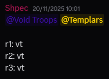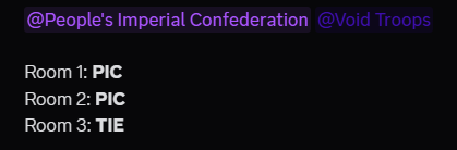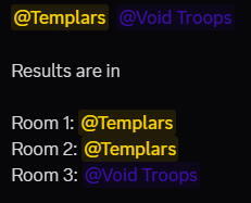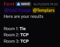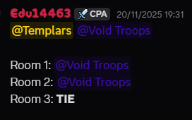 Later that day, another battle took place, which would signal the volatile nature of this war. Room 1 began once more with both armies performing evenly, resulting in a tie. Room 2 begins with the Templars entering first, and them pulling ahead in terms of size, as well as having notably superior formations and overall tactics. As a result, Room 2 was a Templars victory. Room 3 was a noticeably similar story to the previous room, with Templars outperforming the Void Troops in every manner, resulting in another victory for TCP. As a result, TCP claimed victory in the second battle of the war.