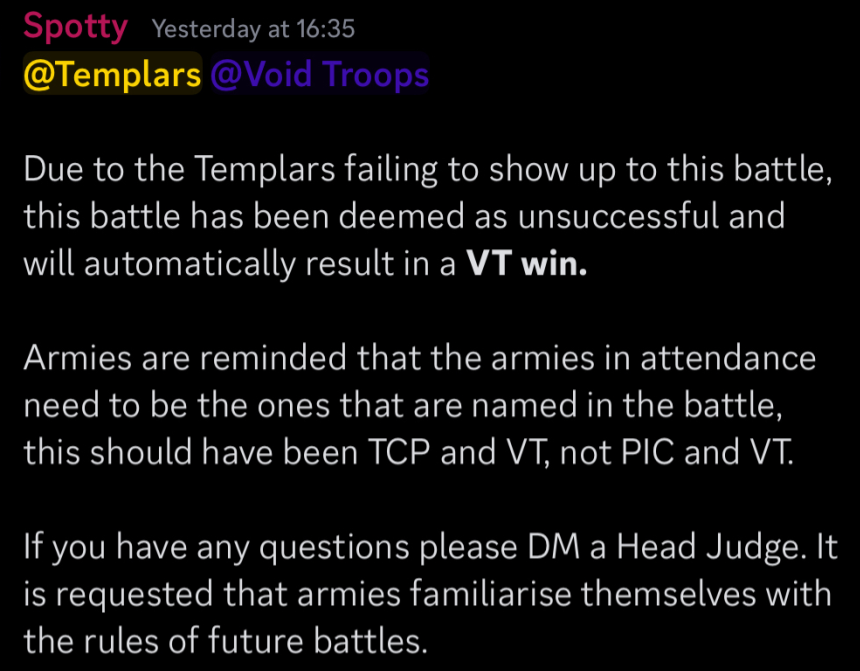Due to TCP failing to attend, with members instead using the PIC army tag, this battle was invalidated, resulting in an automatic VT win.
