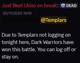 This battle marks the advent of external help for the Void Troops, and due to the Templars’ failure to attend, the Dark Warriors were automatically victorious.