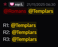 The first battle of the war involving the Romans began with them being highly inactive, and despite having a small size advantage, this led to them losing their first Room of the war. Room 2 was extremely similar, with Templars having better formations, speed, size and coverage, resulting in another TCP victory. The third and final room of this battle played out very similarly to the previous two, with the Romans failing to complete many tactics, resulting in a 3-0 TCP victory.