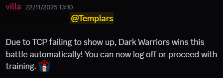 Once again, we see a Dark Warriors invasion of Templars’ land in which the Crusaders fail to emerge. This results in another automatic DW victory.