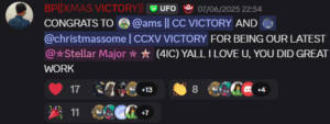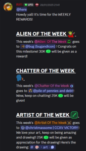 After spending some time with the Aliens, Cuddlesome had put in some good work in the army. She put great effort into the Aliens’ artistry department, and her skills and dedication were soon recognised. On January 28, 2025, her first major achievement came: “Artist of the Week”, which was handed down from the Aliens leader, Sheriff himself.
