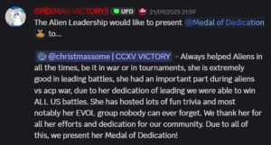 Cuddlesome sought more than just a fourth-in-command role, though. Still, even at Stellar Major, she would continue to shine as one of the Aliens’ most dedicated troops. After all the hours she had clocked in for the Aliens, she was finally allowed to climb the ranks once more. On August 10, Cuddlesome hit the rank of Stellar General, which was second-in-command within the ranks. Which, as of December 1, 2025, is her current rank. To commend her for everything she had done for the Aliens, BP gave Cuddlesome the “Medal of Dedication” on September 21.