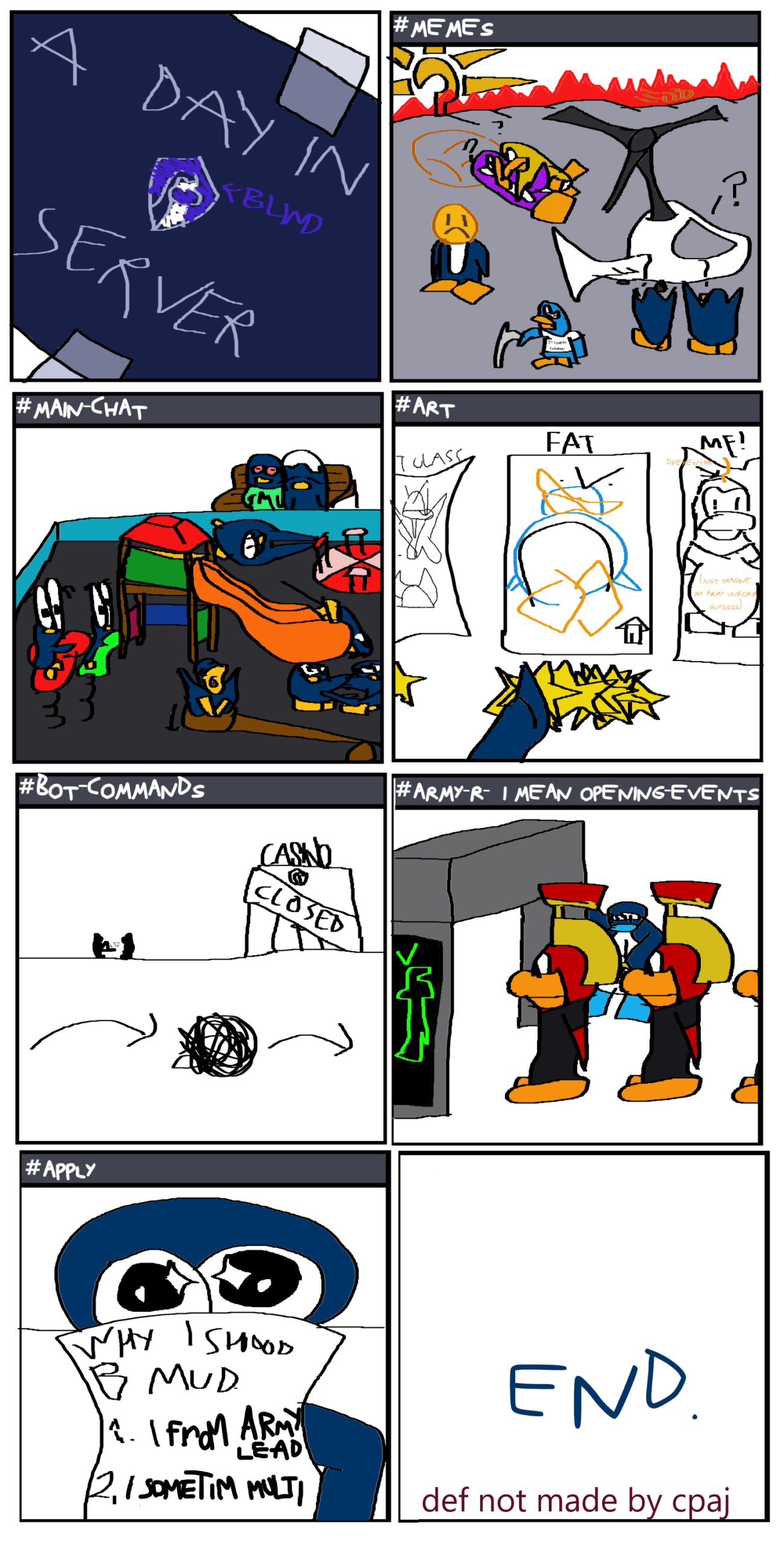 The comic begins with a panel containing the title “A Day in the Club Penguin Armies Server”, while also noticing the fact that the CPA penguin has no eyes. In the next one, we see the #memes channel. In it, there are many unfunny memes, with people gaining the unfunny role. At the same time, memes are going back and forth against each other, between the Void Troops and the Templars. There are also random memes being posted with people reacting with question marks. An old penguin, with a stick, is passing by it, complaining about what’s happening in there.