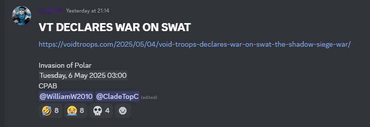 SWAT, founded in 2009 by Ganger90 has witnessed some recent changes in their leadership and army structure with Operation Phoenix. The changes included the introduction of leaders AB and xDemon, who have both had former positions in VT High Command and leadership, respectively.